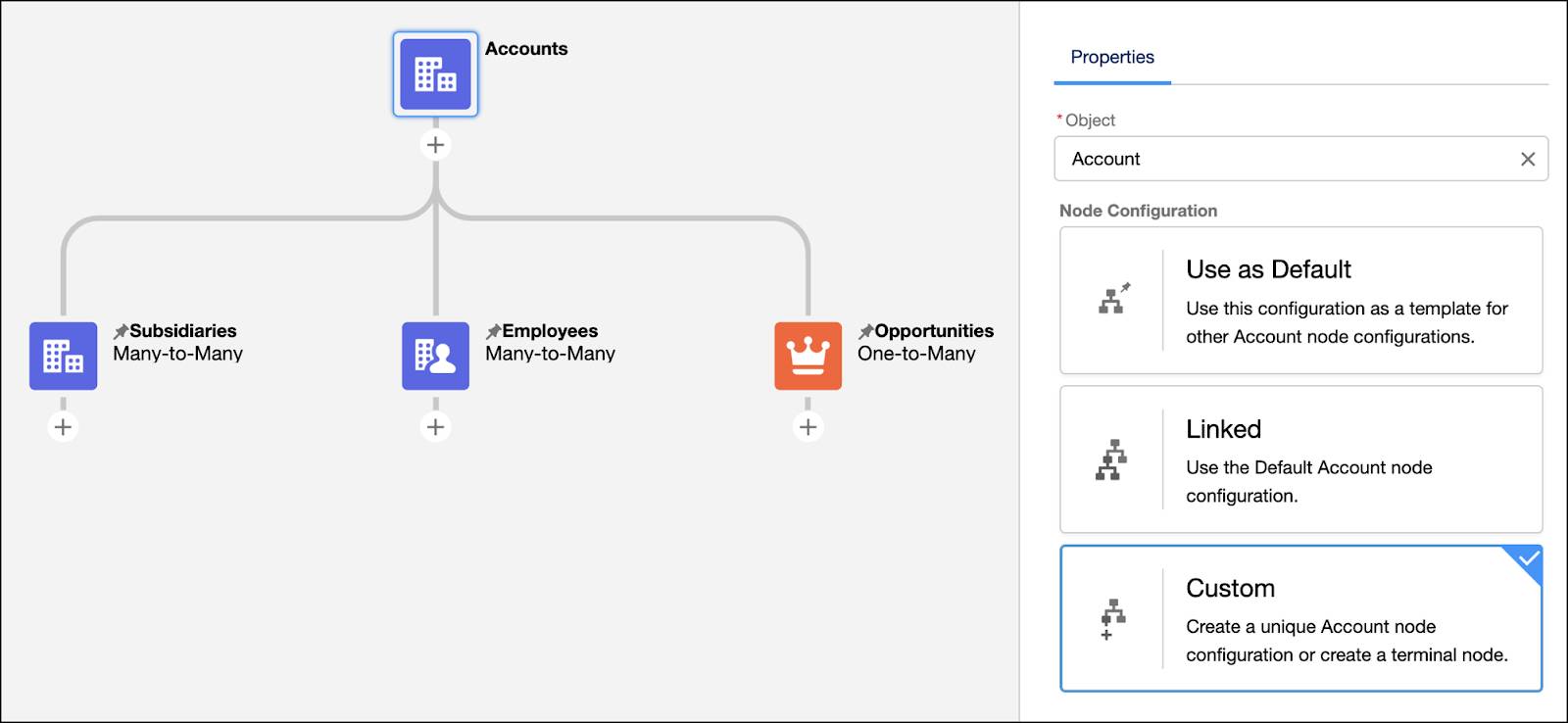 The root node must be account because the root node object must match the object of the record page where you want to show the graph. Retail bankers also want to see their client’s employees, opportunities, subsidiaries, financial accounts, liabilities, and assets.