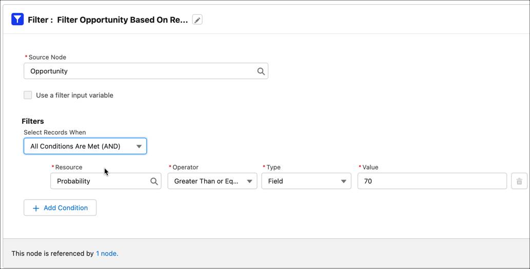 - In the node Filter Opportunity Based on Result, change Select Records When to All Conditions Are Met (AND).