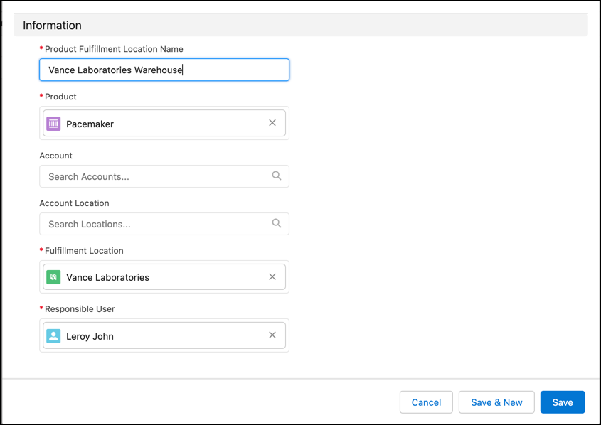 The Product Fulfillment Location object associates sales reps with the inventories they own and the accounts they are responsible for. Soumodip creates a product fulfillment location to associate Leroy with the inventory of pacemakers at Vance Laboratories.