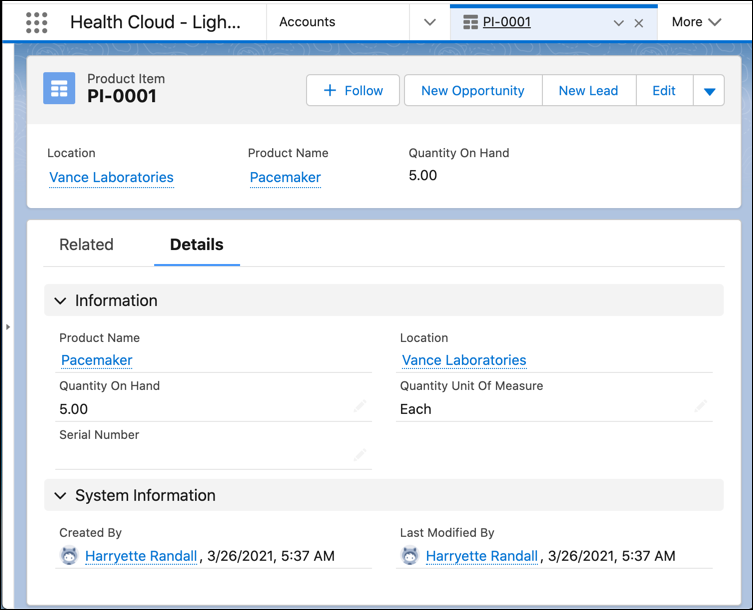 Having easy access to information about products and inventory will make it easier for Leroy to accommodate his clients’ needs. Since Leroy sells pacemakers to StayHealthy Hospital, Soumodip adds information about the device and its price to Life Sciences Cloud.