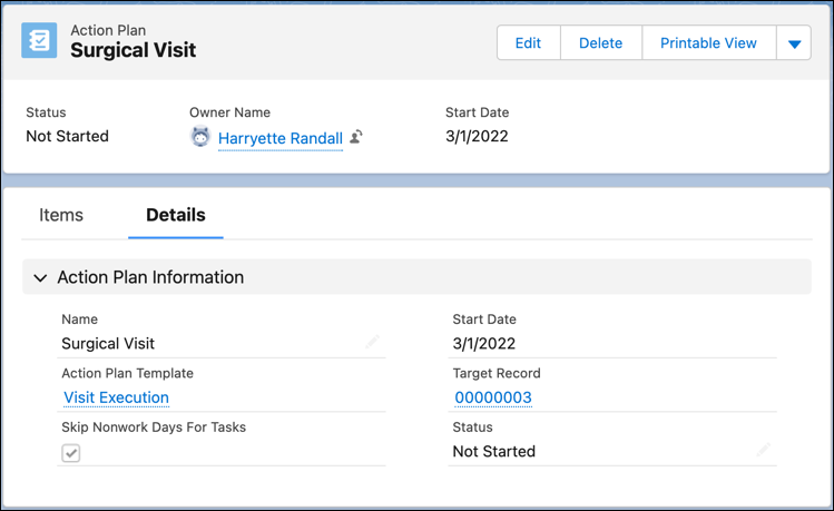 [Alt text: An Action Plan record showing the association of an action plan template and a visit record.]