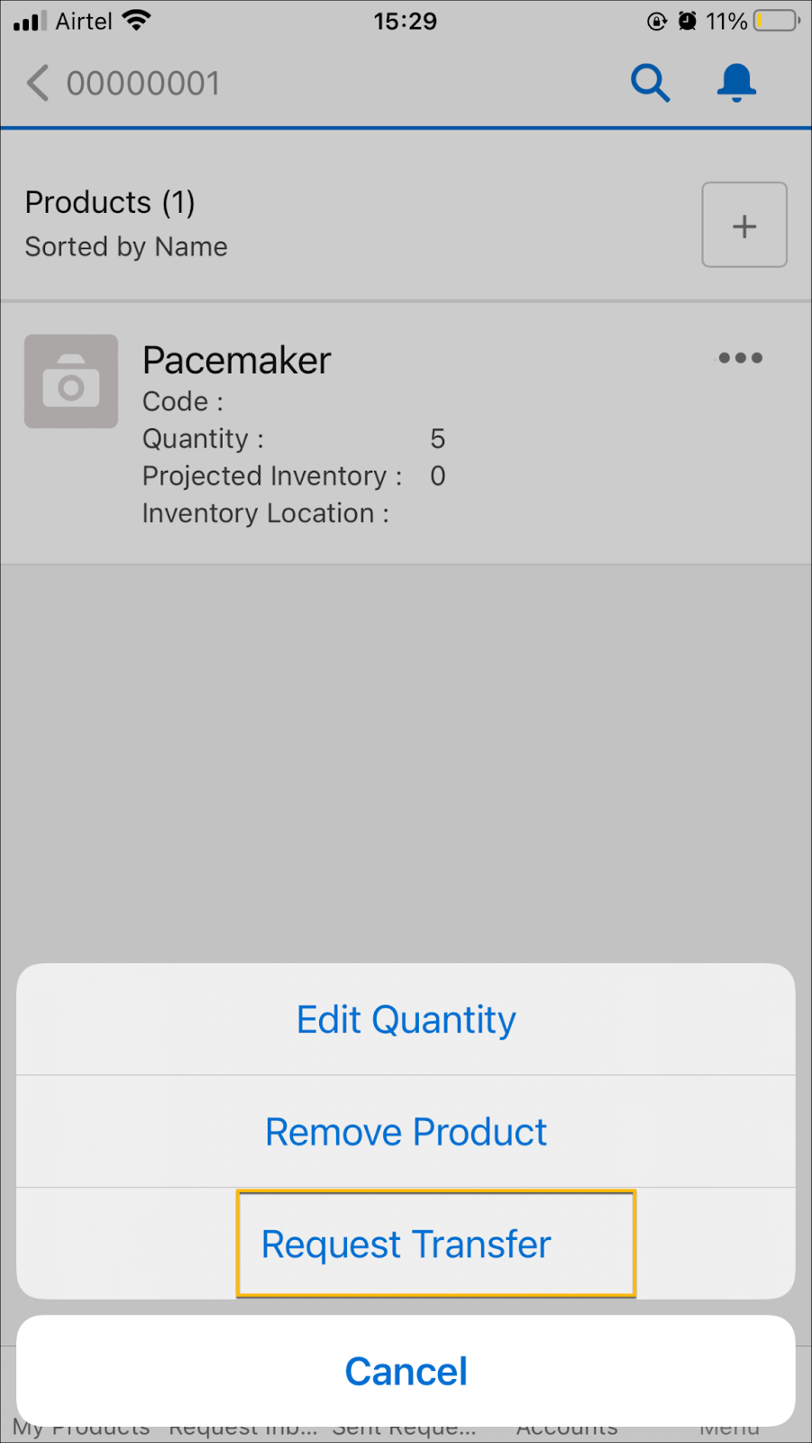 Leroy finds another inventory within a 50-mile radius to request a product transfer from. Here’s how he requests a product transfer from the mobile app.