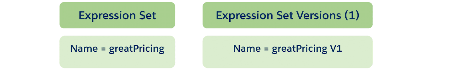 Justus begins by creating a new expression set named greatPricing. Salesforce automatically creates its initial version named greatPricing V1. He can easily add more versions as pricing models evolve over time.