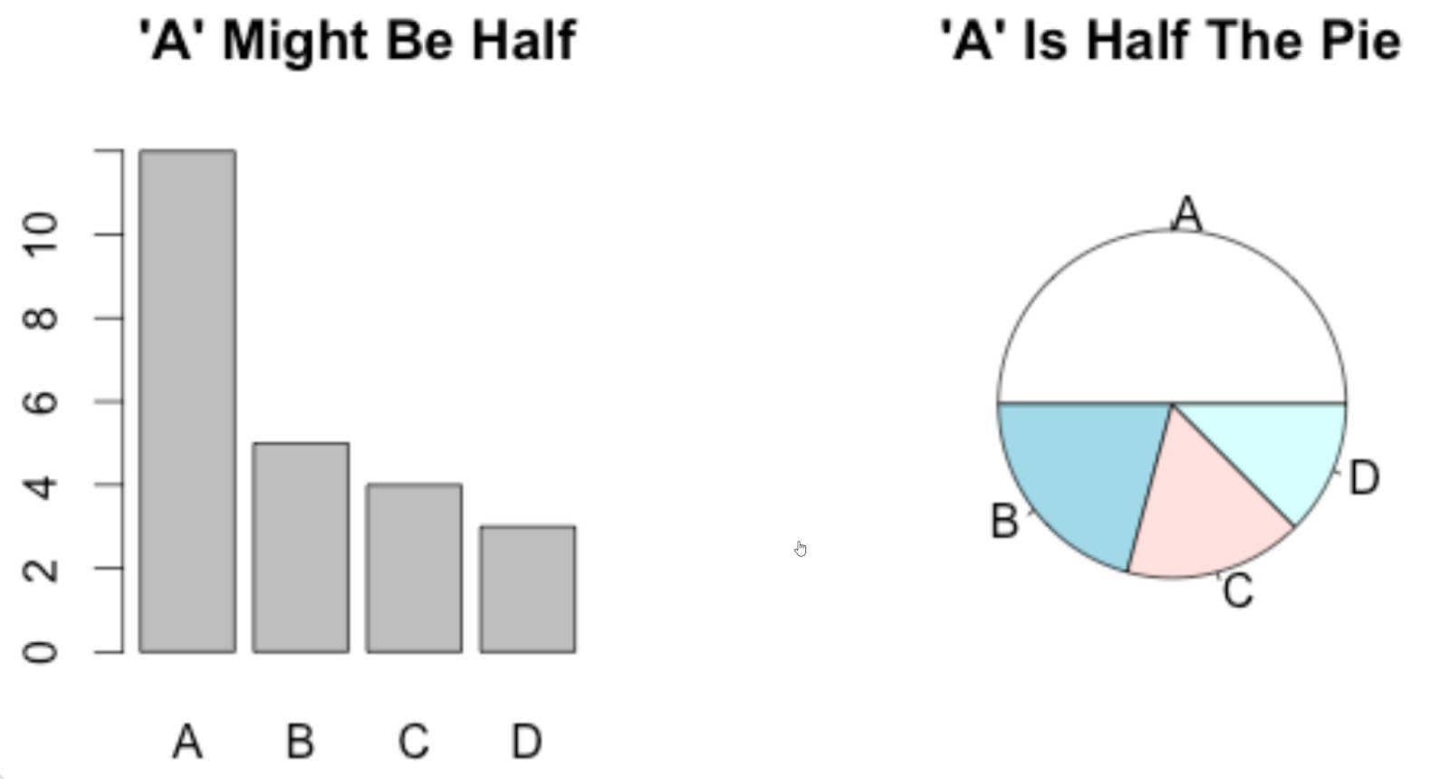 In your journey with data visualizations, you might come across three-dimensional (3D) graphs. Although 3D images might grab your attention, they make it much more difficult to interpret charts. When 3D objects are closer in the frame, they appear larger. Normally that’s not a problem, except for when you’re trying to make comparisons based on size. Compare the following two graphs.