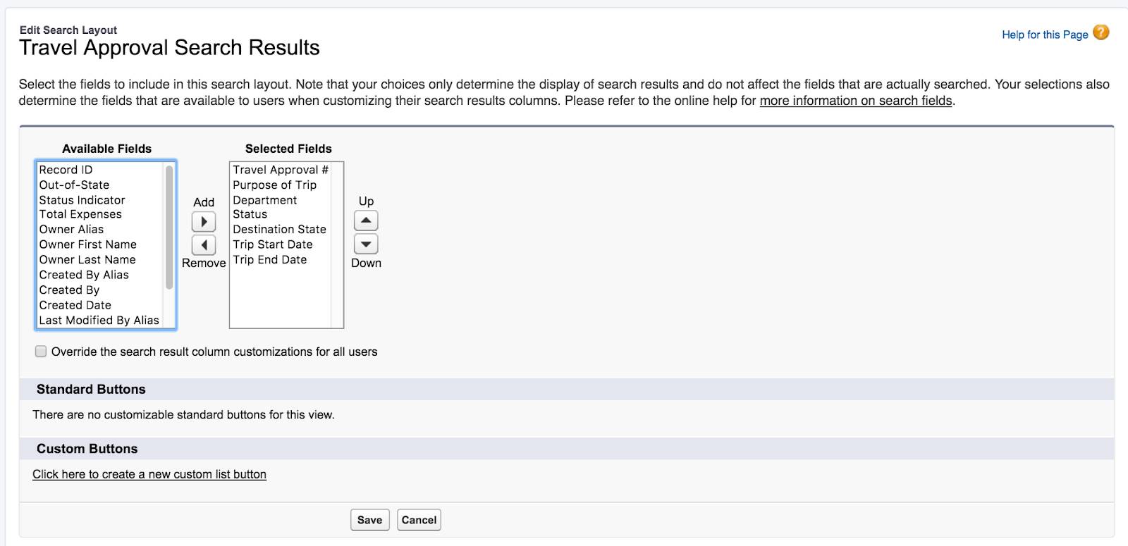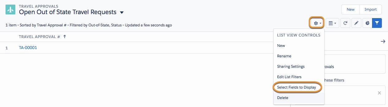 You can also create a custom list view for your own use. Your custom list views can be private, or you can make them accessible to other users. In this scenario, you create a list view with a filter to show all out-of-state travel requests that have not been approved or rejected. This way you can see exactly what approvals are still outstanding.