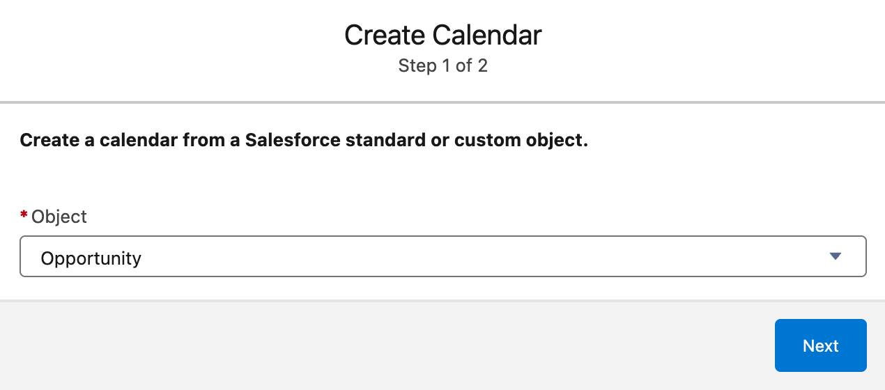 - Sélectionnez l’objet requis dans la fenêtre contextuelle Create Calendar (Créer un calendrier). Pour cet exemple, sélectionnez Opportunities (Opportunités).
