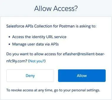 [Texte Alt : Capture d’écran de la boîte de dialogue d’autorisation de l’accès qui s’affichera pour demander si Postman est bien autorisé]