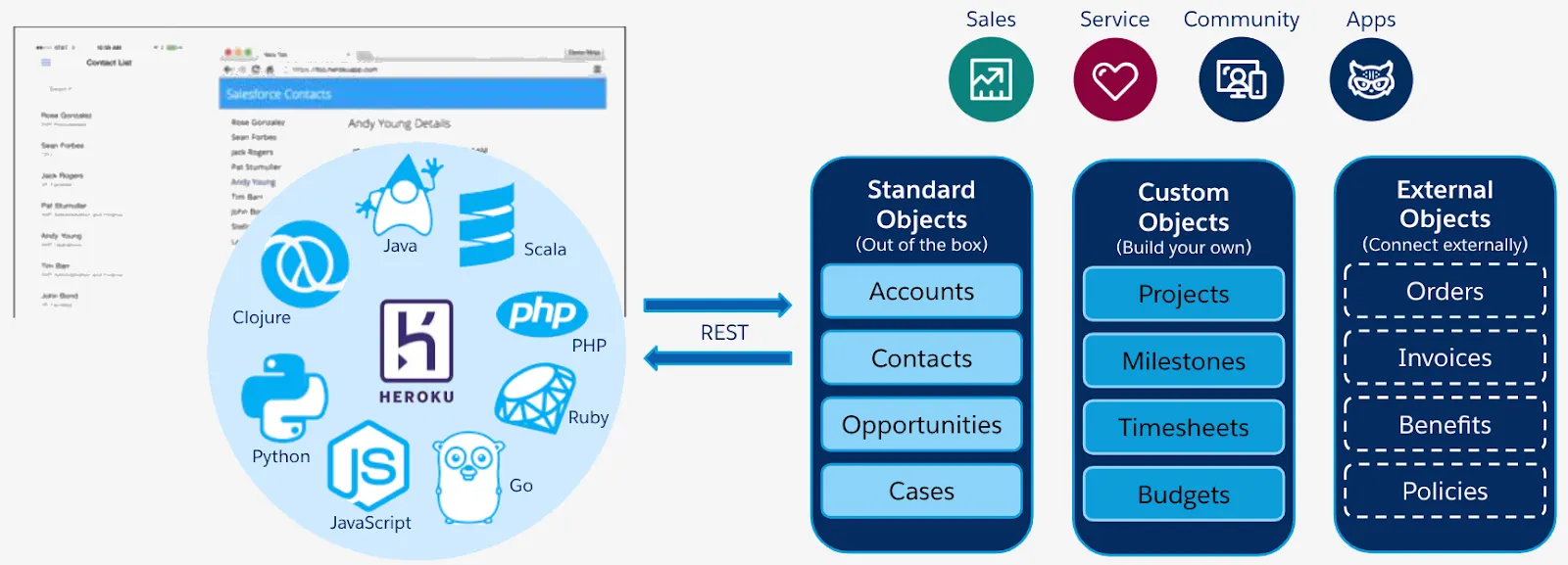 [Texte Alt : Image montrant une connexion entre des objets internes à Salesforce et Heroku grâce à une interface REST]