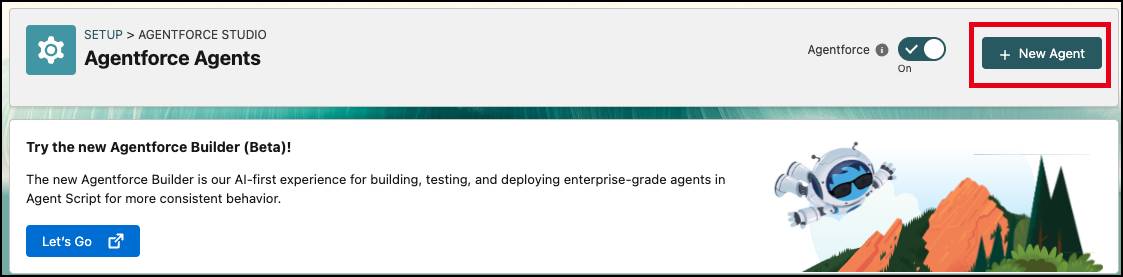 - Nella parte alta della pagina di impostazione Agentforce Agents (Agenti Agentforce), fai clic su + New Agent (+ Nuovo agente). Nota: se non vedi il pulsante New Agent (Nuovo agente), aggiorna la pagina fino a quando non viene visualizzato.