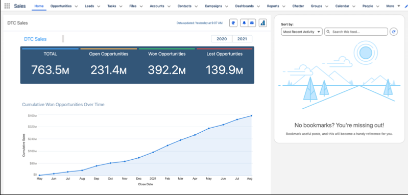 The DTC Sales dashboard is now available to everyone who uses the Sales home page. (They might need to refresh the page to see the updated version.) And every time she looks at the home page, the CEO smiles.