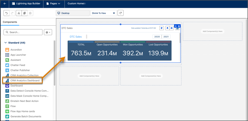 8. Drag the CRM Analytics Dashboard component from the list on the left to the top right area of the Home page.